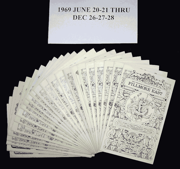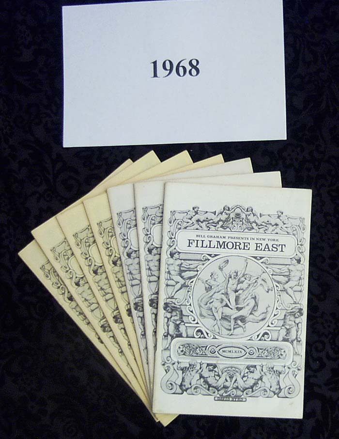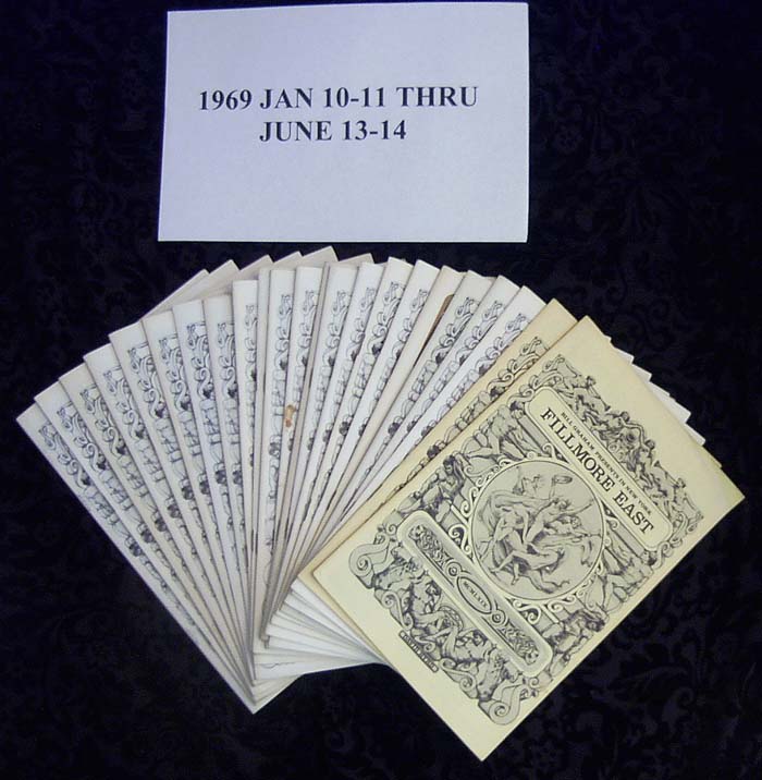 This is a complete collection of ALL (97) programs from the old Fillmore East venue from November 28-29-30, 1968 to October 12, 1970.  These programs were originally purchased at the "Rock Relics Auction Show" on October 12, 1970.  All programs are in mint, original condition, having been stored in plastic bags for the last 37 years.